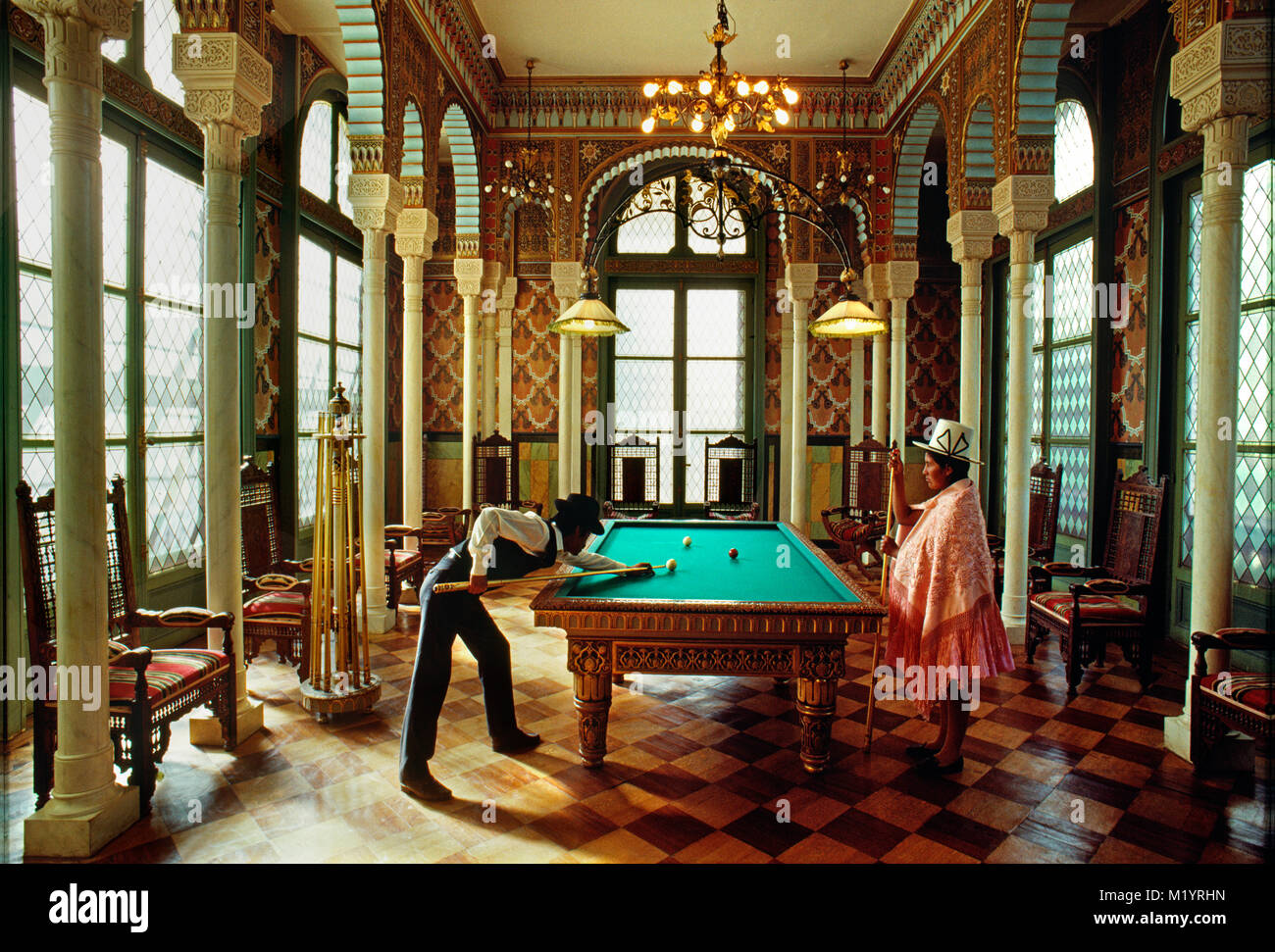 Bolivia Cochabamba Un Hombre Y Una Mujer Jugando Al Billar En El Palacio El Palacio Portales Una Copia Replica De La Alambra Palace De Granada En Espana Fotografia De Stock Alamy